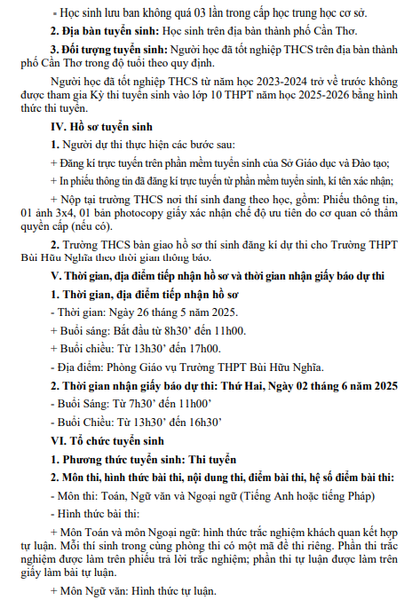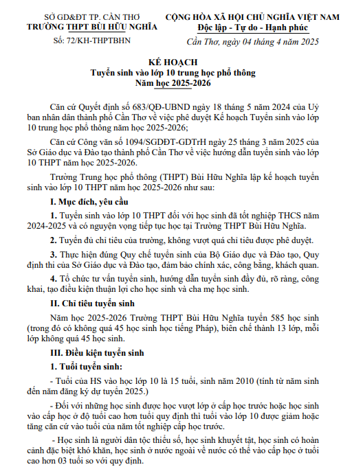 Kế hoạch số 72/KH-THPTBHN Tuyển sinh vào lớp 10 trung học phổ thông Năm học 2025-2026 Đã đăng trên 14/06/202502/07/2025 bởi quantrituyen Đính kèm Kế hoạch số 72/KH-THPTBHN Tuyển sinh vào lớp 10 trung học phổ thông Năm học 2025-2026 Công đoàn trường THPT Bùi Hữu Nghĩa – Lan tỏa yêu thương, chào Xuân Ất Tỵ 2025 Lễ Tổng kết năm học 2024 – 2025 tại Trường THPT Bùi Hữu Nghĩa